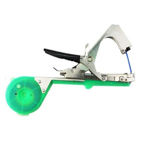 A tool designed to support and guide the growth of climbing plants such as grapes, tomatoes, cucumbers, peppers, and roses. This handheld device helps secure plants safely to stakes or trellis wires without damaging the stem, making garden maintenance more efficient.